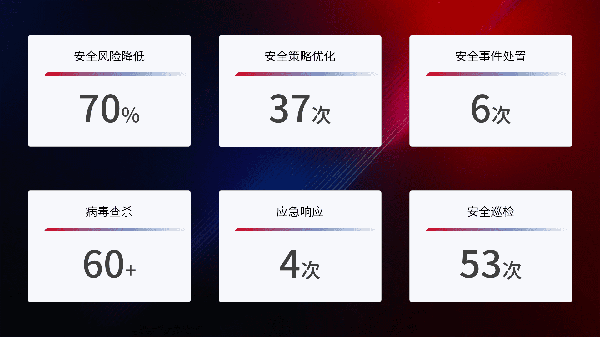 提供全面的安全事件报告体系,,,,包括处置报告、、、、周报、、季度和年度总结,,,结合持续监控,,帮助客户深入了解网络安全状况。。。。